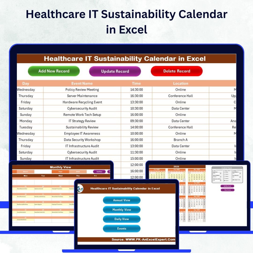🌿 5 Ready-to-Use Worksheets – Includes Home, Annual View, Monthly View, Daily View, and Events sheets — all designed for structured tracking.Healthcare IT Sustainability Calendar in Excel
