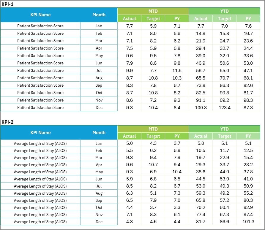 Actual vs Target Comparison – See where your healthcare KPIs stand against set benchmarks.
