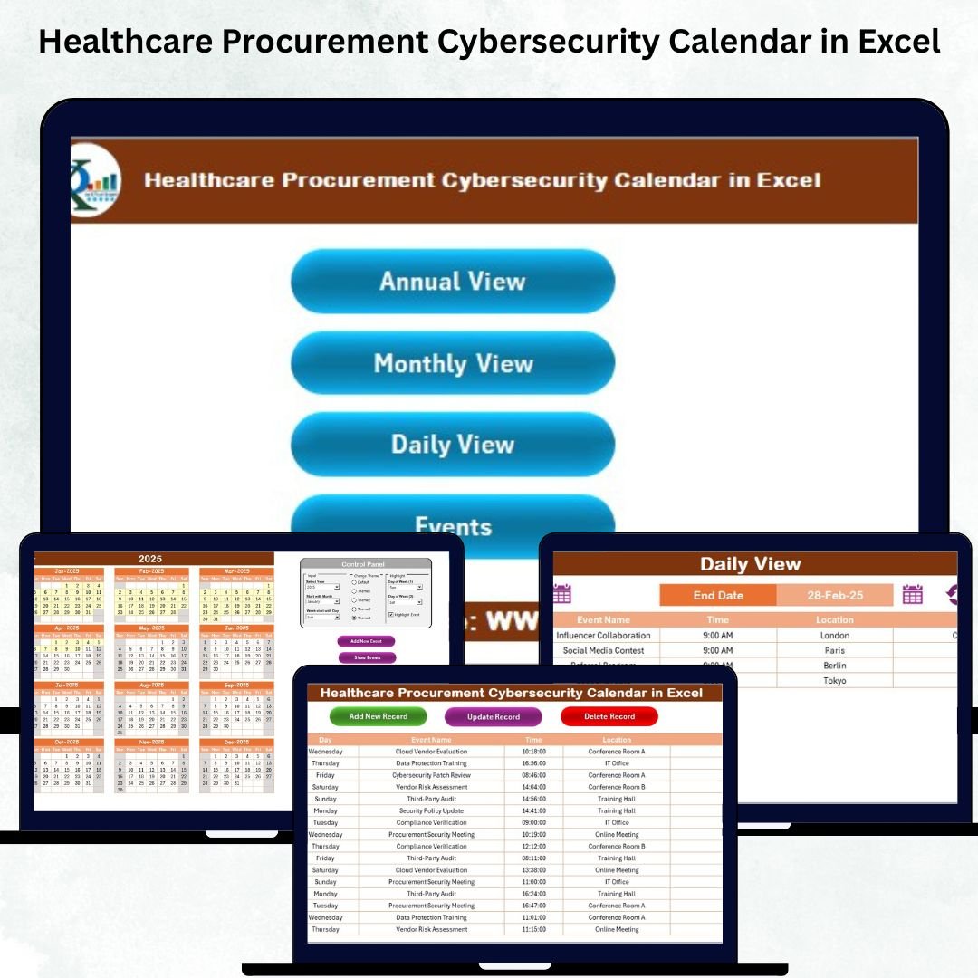 The Healthcare Procurement Cybersecurity Calendar in Excel is a powerful, ready-to-use Excel template designed to solve this exact problem. It brings all procurement and cybersecurity tasks into one centralized, automated, and easy-to-use workflow. With annual, monthly, and daily views, smart event forms, color themes, and a master event database, this template gives healthcare teams full control over their operational and cybersecurity schedules.