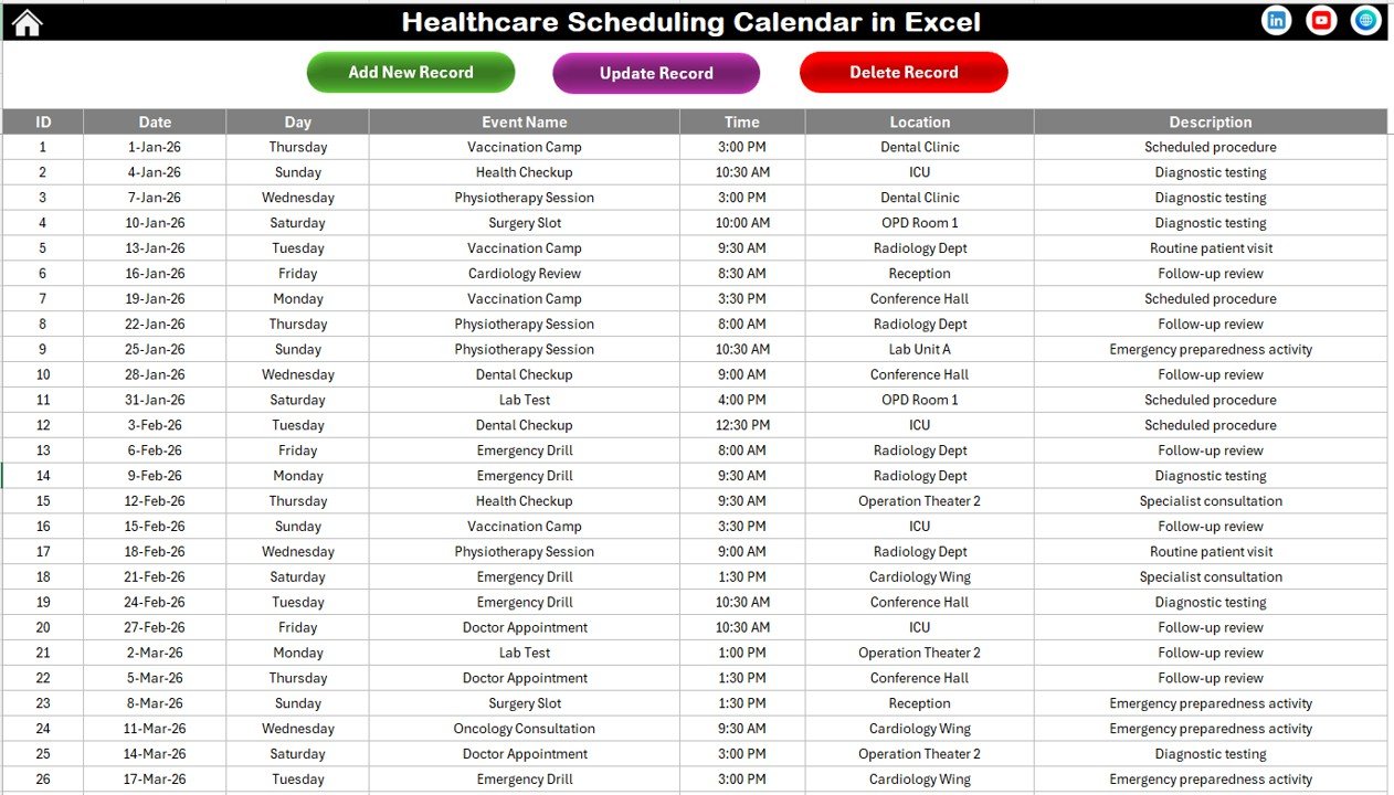 Healthcare Scheduling Calendar in Excel This ready-to-use Excel template helps you manage annual planning, monthly appointments, daily event tracking, and full event database management — all in one powerful system.