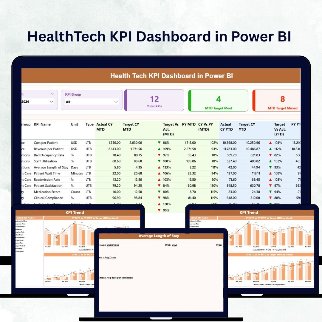 A hospital network, Medcore Hospitals, uses the HealthTech KPI Dashboard to track patient efficiency and financial health.