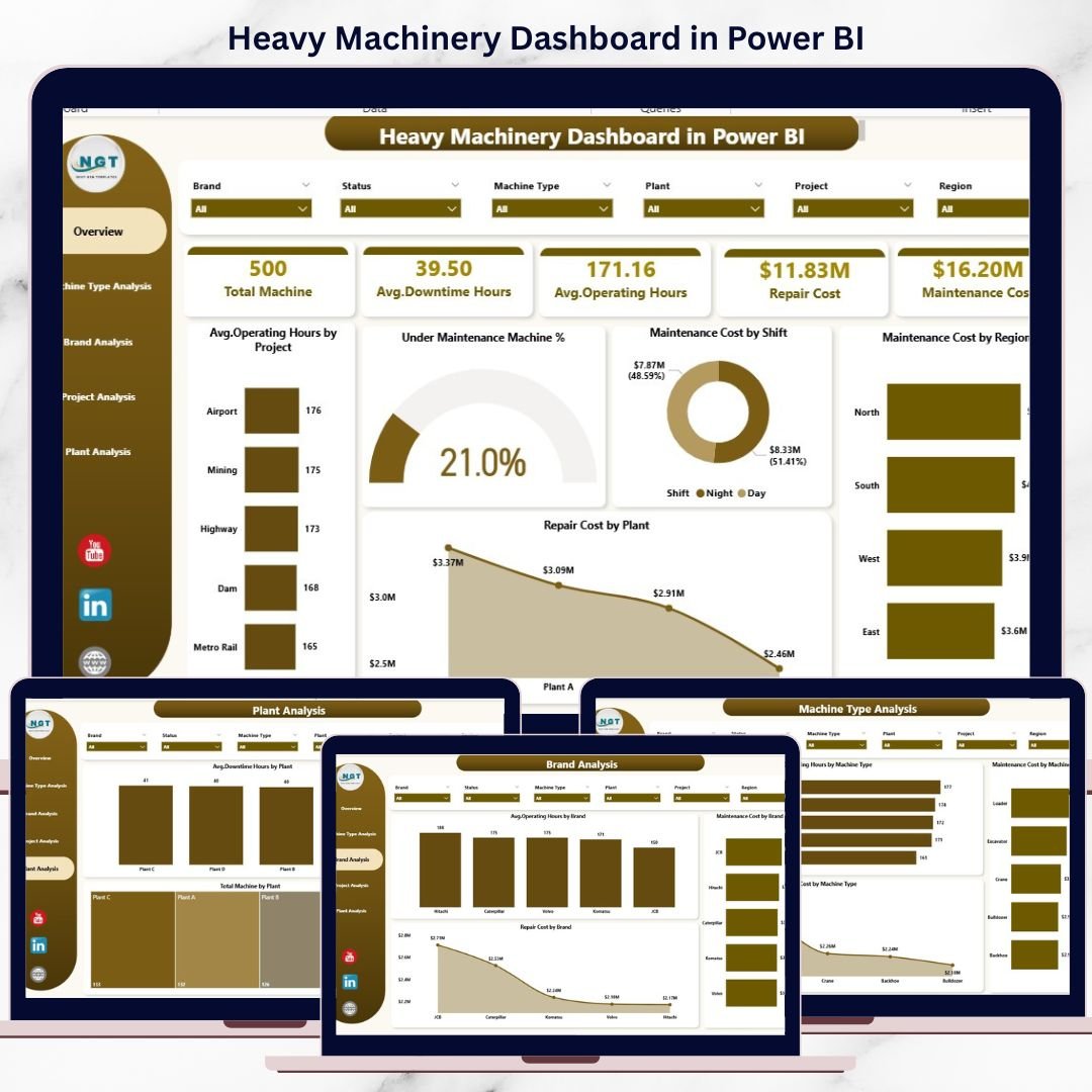 That is exactly why the Heavy Machinery Dashboard in Power BI becomes a critical operational solution 🚀. This ready-to-use dashboard converts raw machinery data into interactive visuals, KPI cards, and analytical insights. Instead of reacting to failures, operations teams proactively monitor operating hours, downtime, maintenance cost, and repair expenses from one centralized Power BI report.