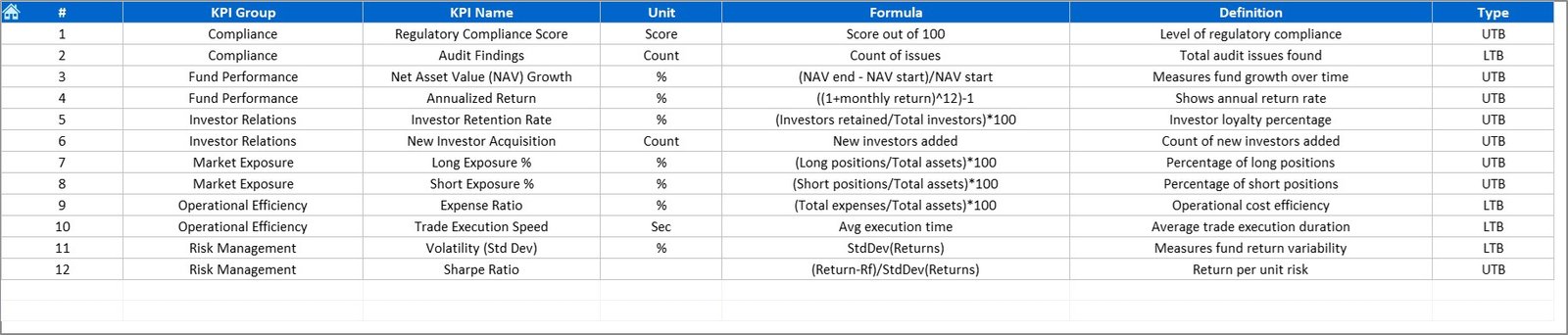 1️⃣ Define KPIs: Add your fund’s metrics in the KPI Definition tab.