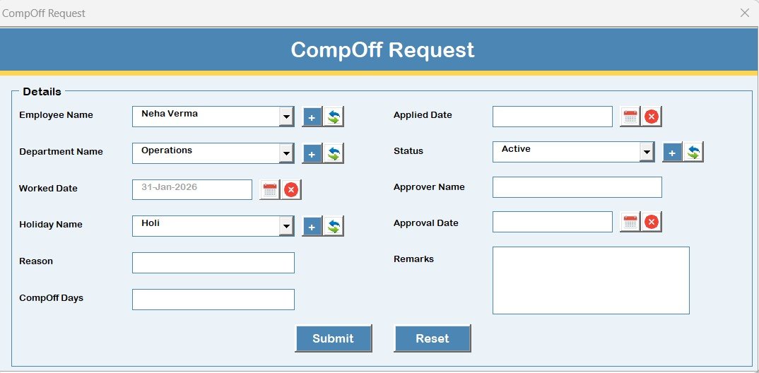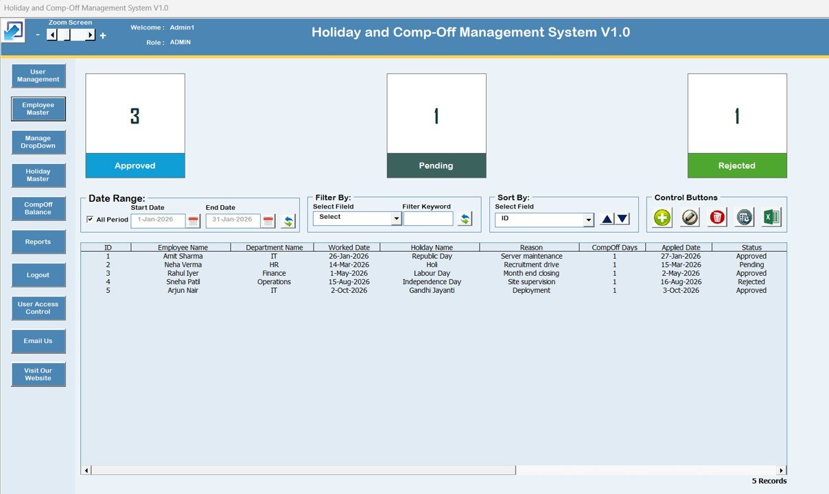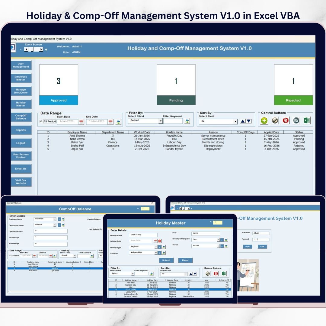 Built with VBA forms, secure login, and structured record handling, this system is designed to reduce manual effort, prevent errors, and make HR work faster and cleaner.Holiday & Comp-Off Management System V1.0 in Excel VBA