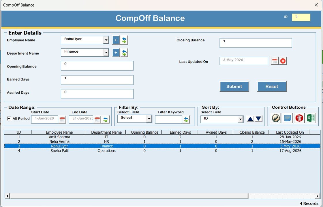 🧾 Centralized Comp-Off & Holiday Records – One file to manage everything