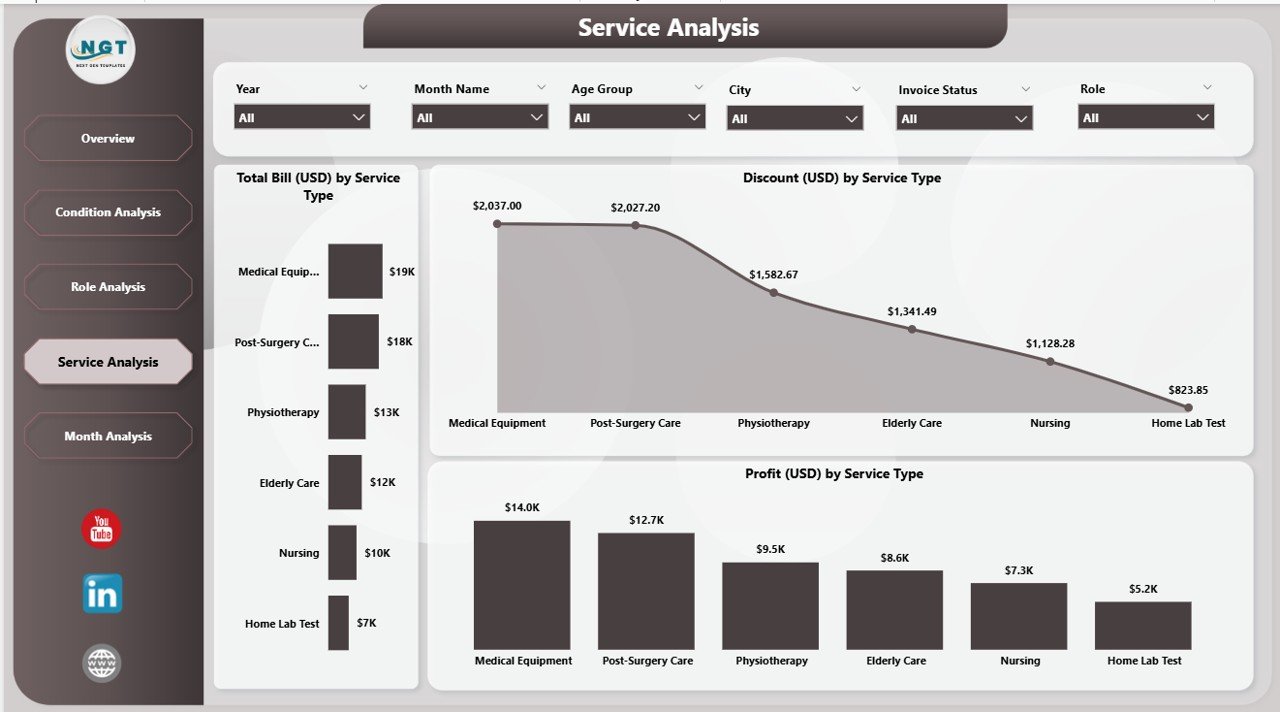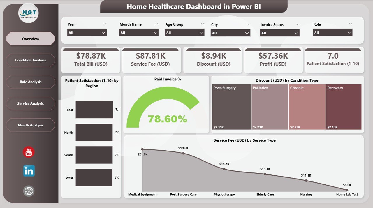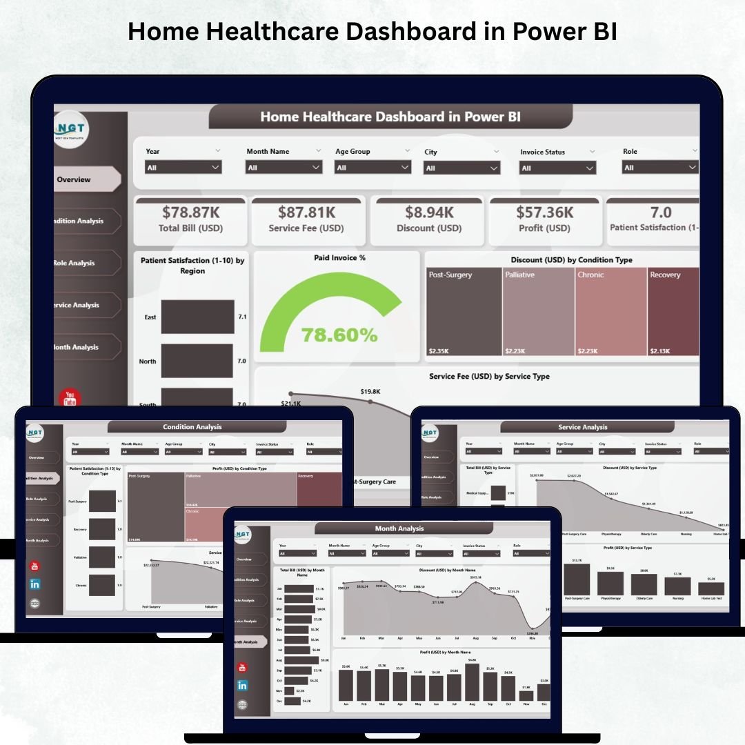 This dashboard includes five analytical pages, each offering a different perspective on home healthcare performance.