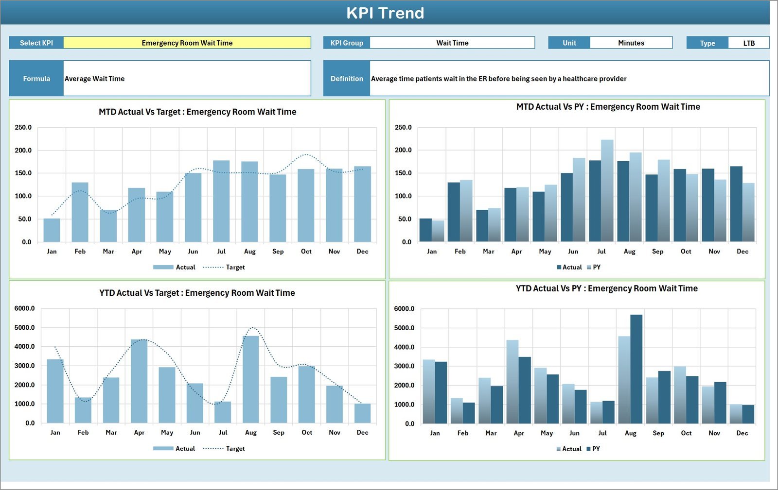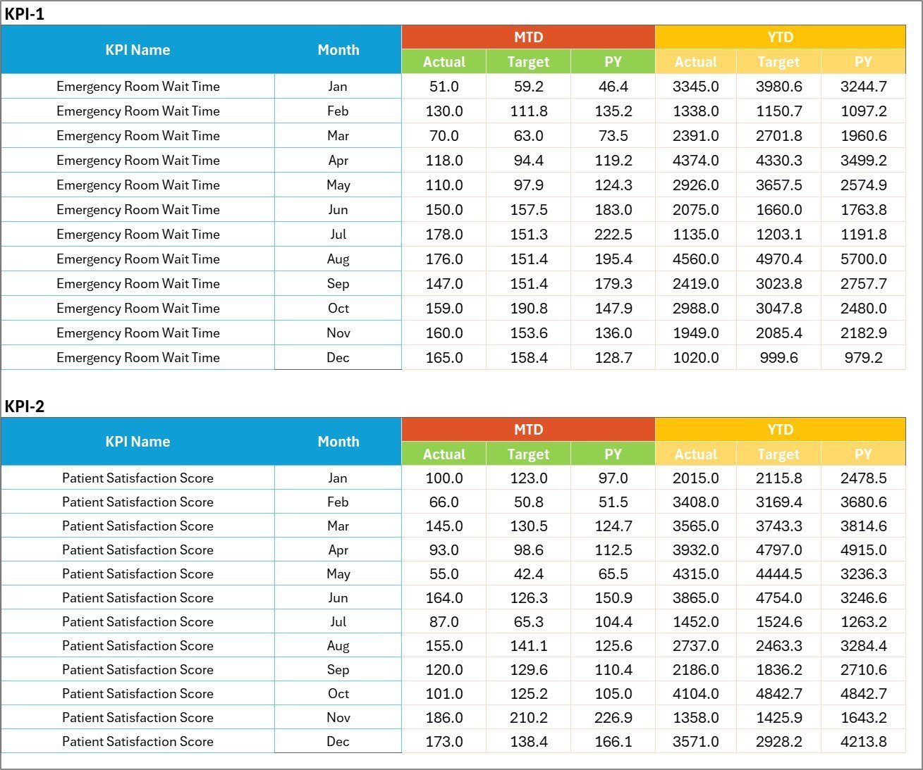 At the core of this template is the Scorecard Sheet, the main interface where you can easily analyze KPI performance. Utilize dropdown menus to select your desired time frame – whether Month, Month-to-Date (MTD), or Year-to-Date (YTD) – allowing flexible and targeted performance reviews. The sheet compares actual results against set targets, providing clear insights into where your hospital stands. Color-coded visual indicators and conditional formatting instantly highlight which KPIs are on track and which require attention, ensuring quick interpretation and proactive management.