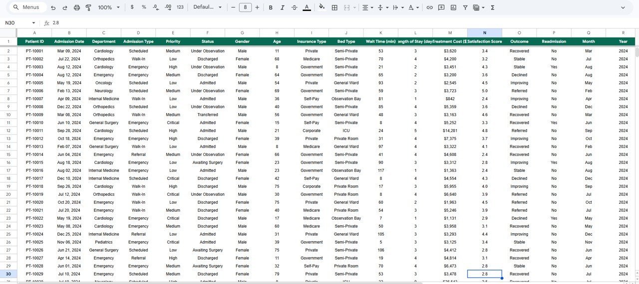 2️⃣ Navigate to the Data Sheet tab and replace the 500 sample records with your hospital’s actual patient data in the same column format.