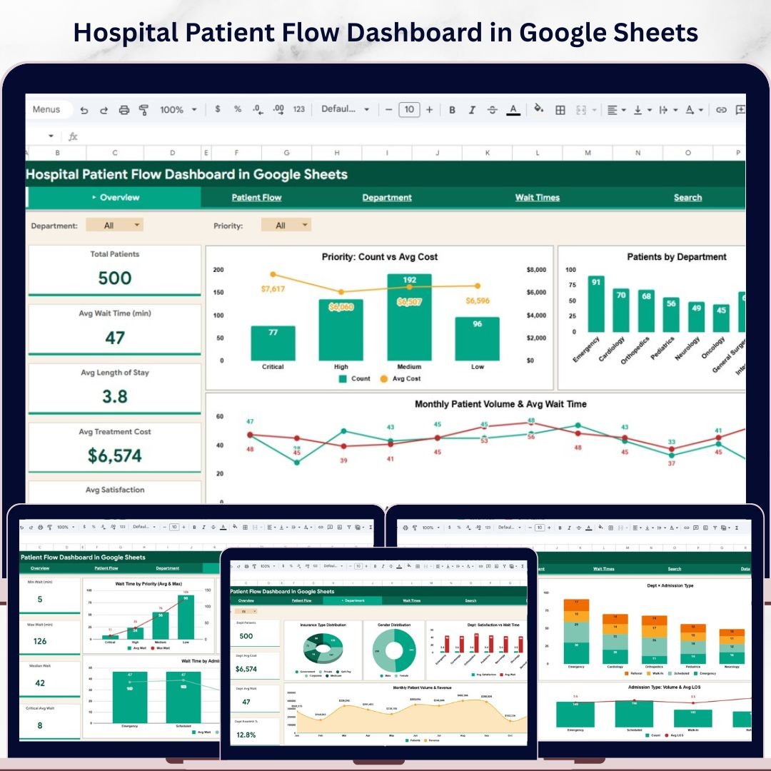 Hospital Patient Flow Dashboard in Google Sheets is a professionally designed, interactive analytics dashboard built for hospital administrators, healthcare analysts, clinical quality teams, and operations managers who need complete visibility into patient flow, department performance, wait times, treatment costs, and patient satisfaction — all inside Google Sheets. This dashboard includes 6 interactive sheet tabs covering every angle of hospital patient management from high-level overviews to granular wait time breakdowns and patient-level search.Hospital Patient Flow Dashboard in Google Sheets