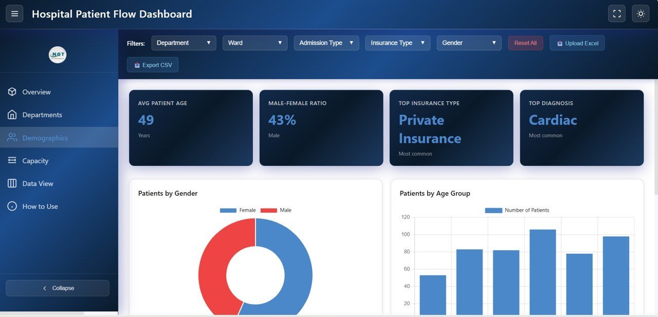 Capacity and Flow📌 Data View Page – A detailed data table page where you can see all patient records with search, sort, and pagination features. You can also export the filtered data to CSV for use in other reporting tools.