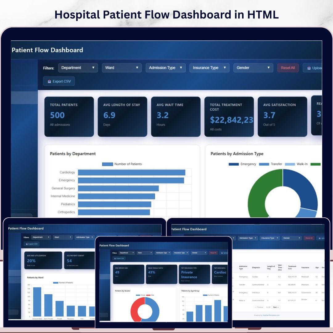 Hospital Patient Flow Dashboard in HTML is a powerful, interactive, and browser-based analytics dashboard template designed to help hospital administrators, healthcare analysts, and clinical teams monitor patient flow, treatment costs, satisfaction scores, and readmission rates across departments — all from a single HTML file that runs in any modern web browser. This dashboard includes 5 interactive pages covering Overview, Department Analysis, Patient Demographics, Capacity and Flow, and a detailed Data View page with search, sort, pagination, and CSV export features.