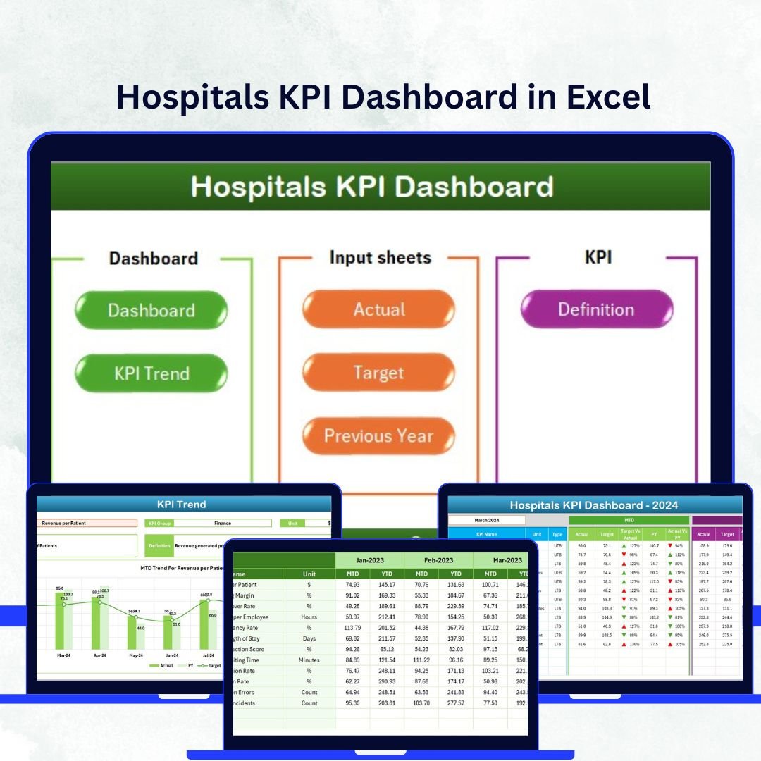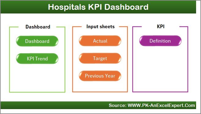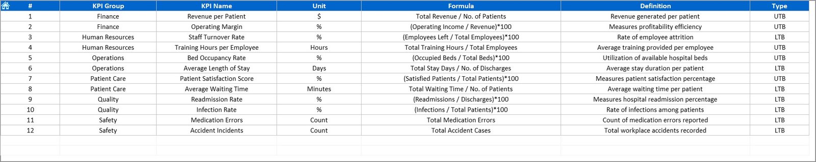 This advanced Excel template is organized into seven interconnected worksheets that streamline hospital performance tracking: