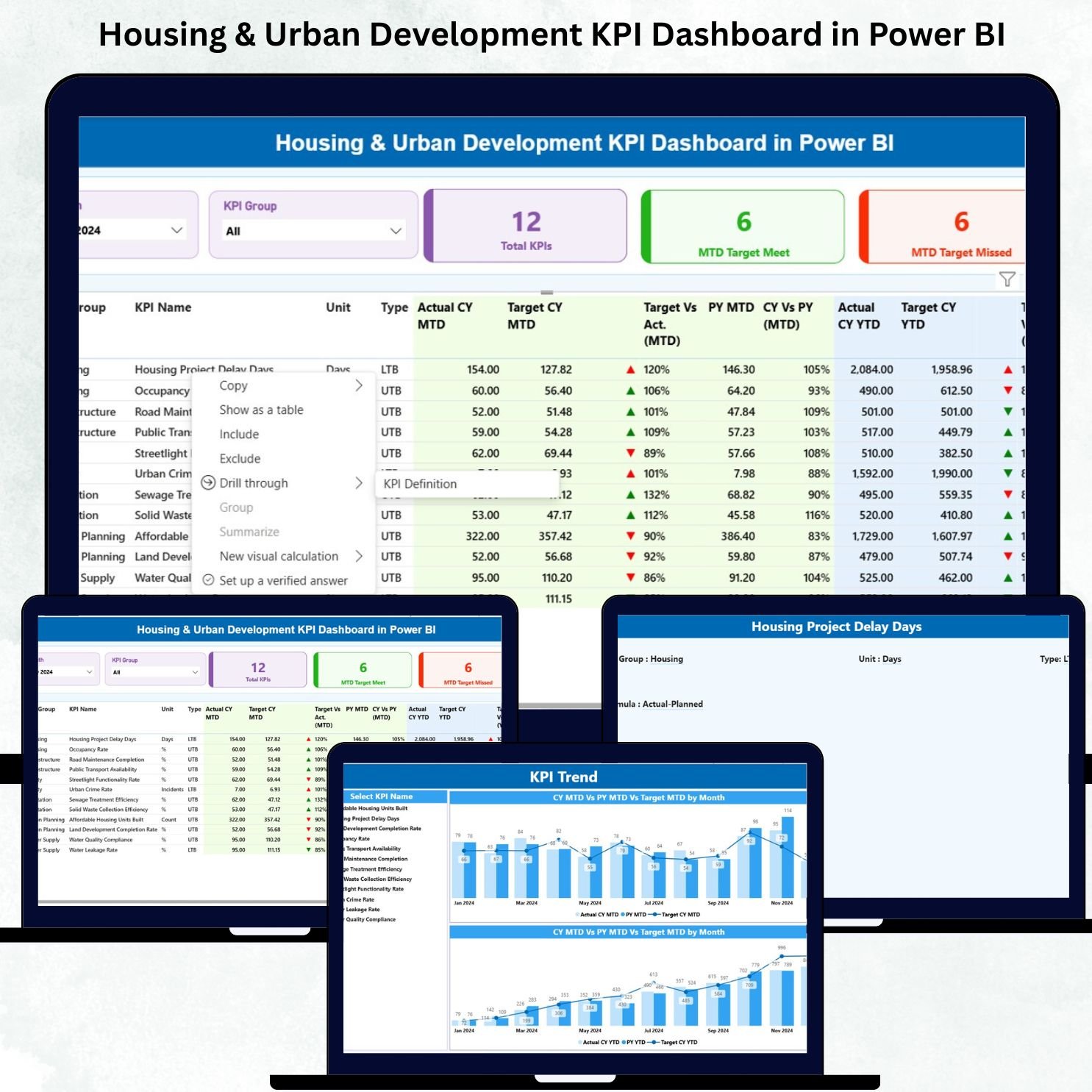 Export to PDF, publish to Power BI Service, or share with leadership in minutes.Housing & Urban Development KPI Dashboard in Power BI