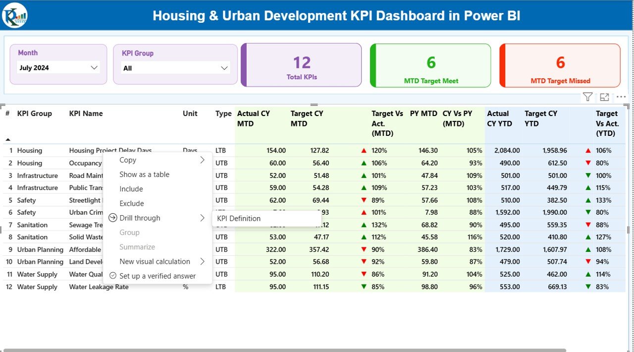 Just fill in Actuals, Targets, and KPI definitions in the Excel file—Power BI updates everything automatically.Housing & Urban Development KPI Dashboard in Power BI