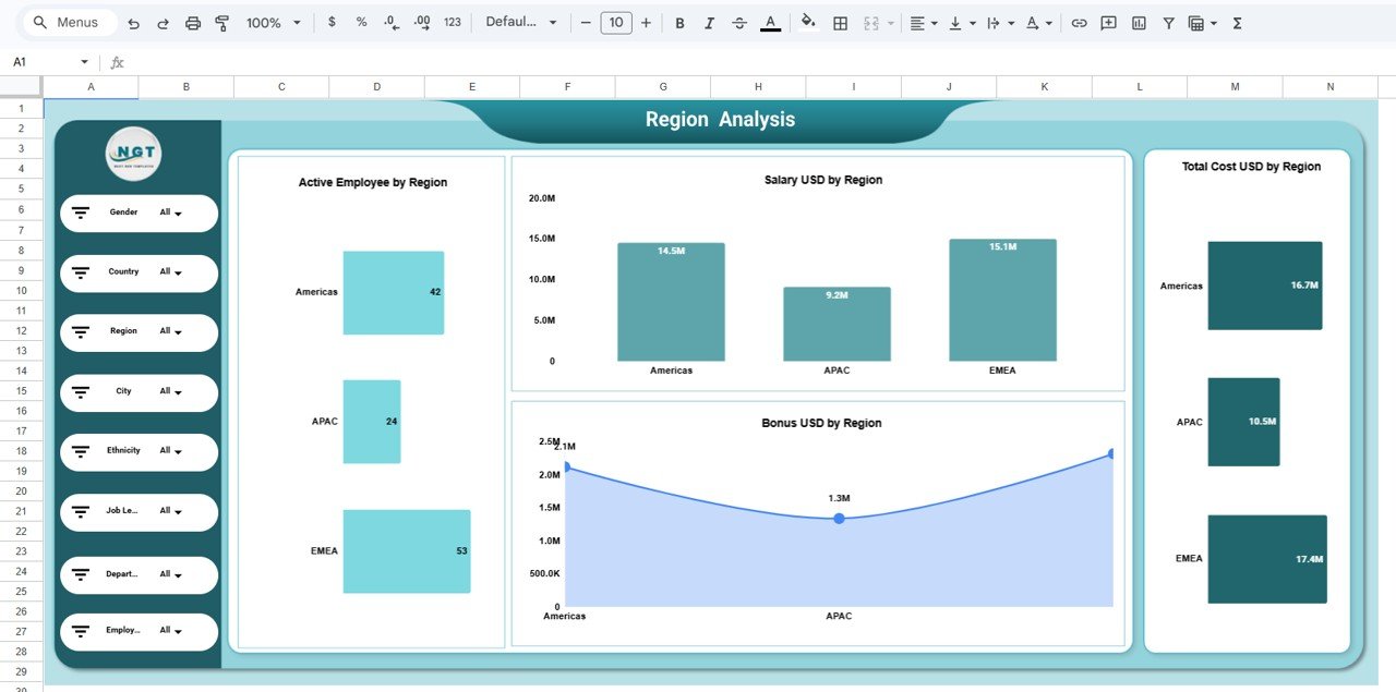 This interactive Google Sheets dashboard allows organizations to track employee performance, analyze workforce costs, monitor department productivity, and evaluate workforce distribution across different regions. By using clear visual charts, KPI indicators, and dynamic filters, HR teams can instantly analyze large volumes of workforce data.