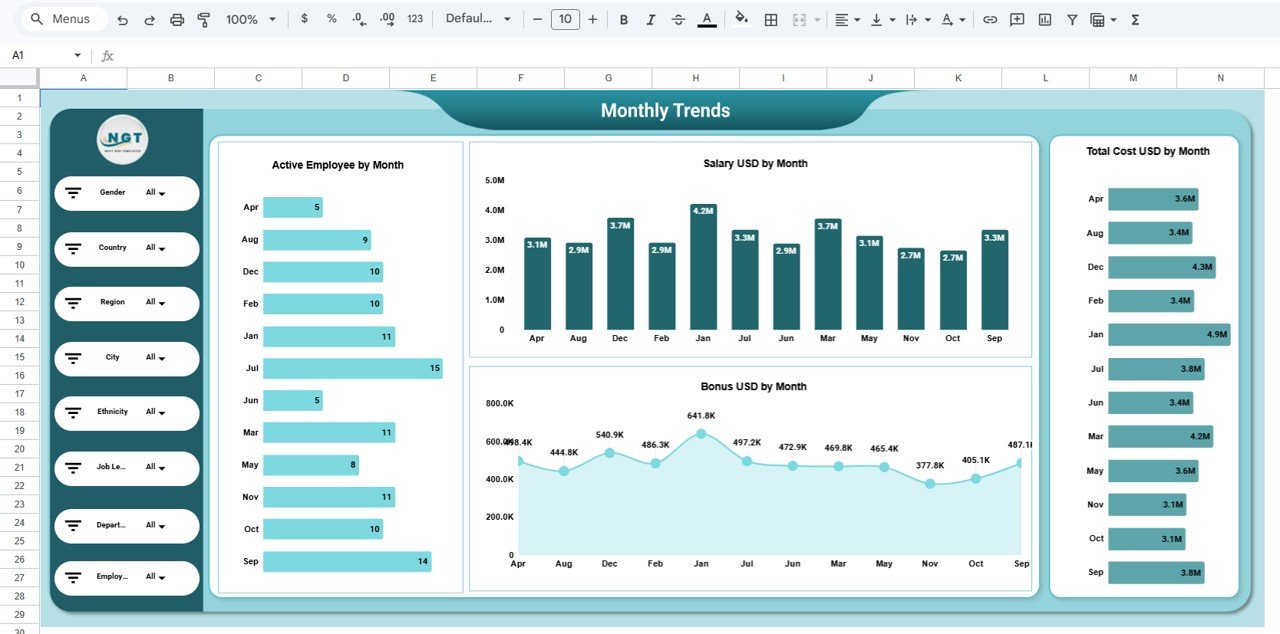 Workforce size, salary costs, and bonus distribution often change over time. This page tracks HR metrics across months.