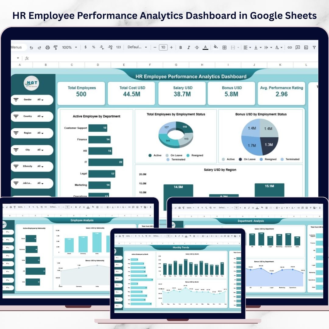 Managing employee performance, workforce distribution, and compensation costs has become one of the most critical responsibilities for modern HR departments. Organizations must continuously monitor employee productivity, salary expenses, bonuses, departmental performance, and regional workforce trends to maintain efficiency and control operational costs.HR Employee Performance Analytics Dashboard in Google Sheets