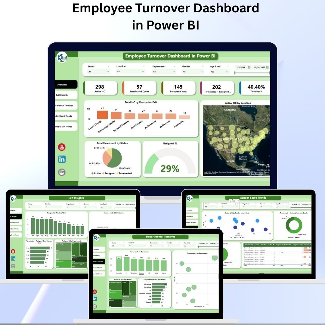 Track resignations, terminations, headcount, and turnover % with interactive visuals covering overview, exit insights, departmental analysis, gender trends, and joining & exit trends.