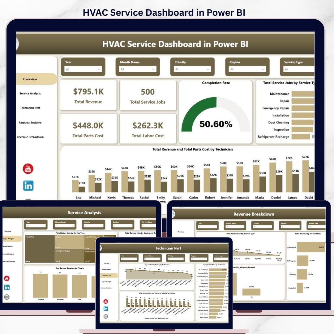 The HVAC Service Dashboard in Power BI tracks 5 headline KPIs — Total Revenue, Total Service Jobs, Total Parts Cost, Total Labor Cost, and Completion Rate — plus 15+ secondary visuals covering technician performance, regional profit, service mix, equipment revenue, and warranty coverage. All metrics update automatically when you refresh your source data.