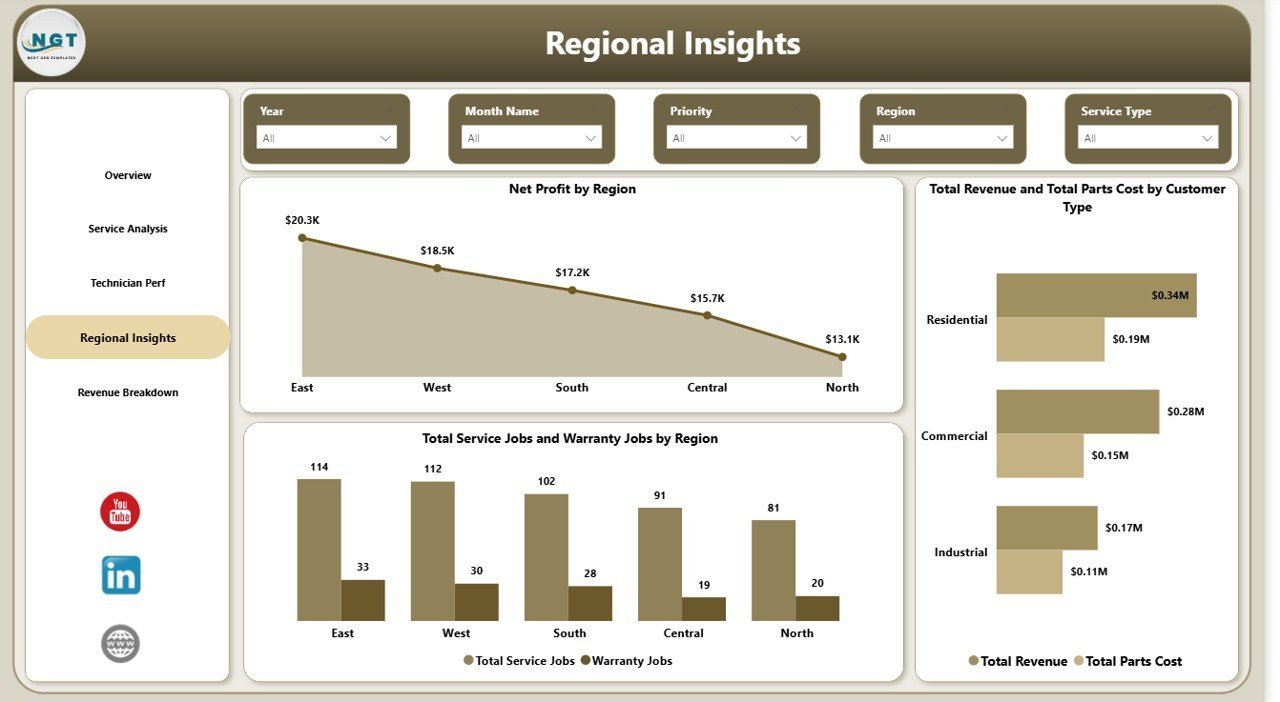 The Regional Insights page translates operational data into geographic profit. Net Profit by Region ranks every service territory by bottom-line contribution — a region with high revenue but razor-thin net profit is usually hiding a parts-markup or travel-time problem. Total Service Jobs and Warranty Jobs by Region exposes which areas are generating the most repeat callbacks. Total Revenue and Total Parts Cost by Customer Type compares residential, commercial, and industrial contribution so you can decide where to invest sales effort.