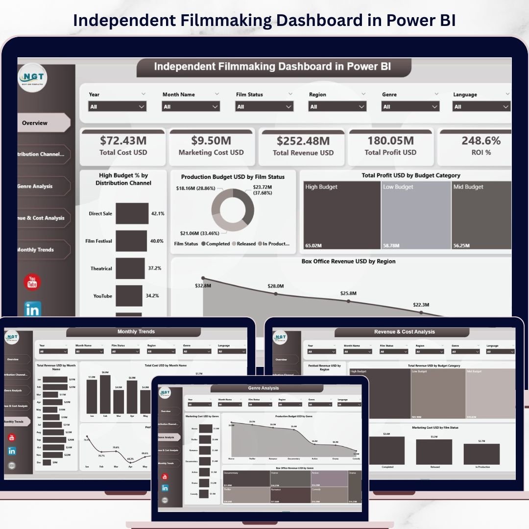 This ready-to-use dashboard includes 5 powerful analytical pages designed for complete filmmaking insights: