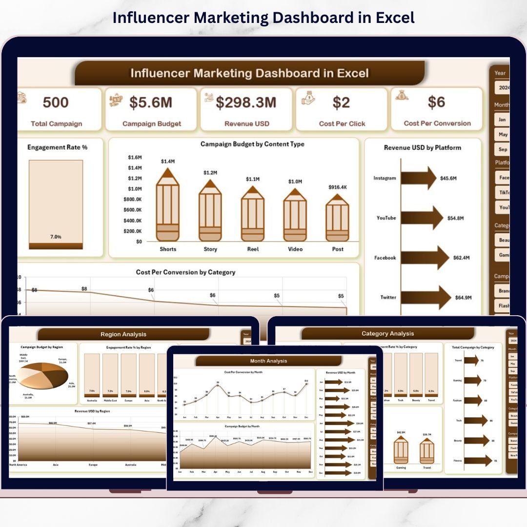 This ready-to-use Excel dashboard converts raw influencer campaign data into clear, structured, and actionable insights. It helps you track campaign budgets, engagement rates, revenue, cost per conversion, ROI, and more—all in one centralized system. Instead of jumping between multiple sheets, you gain instant visibility and control.