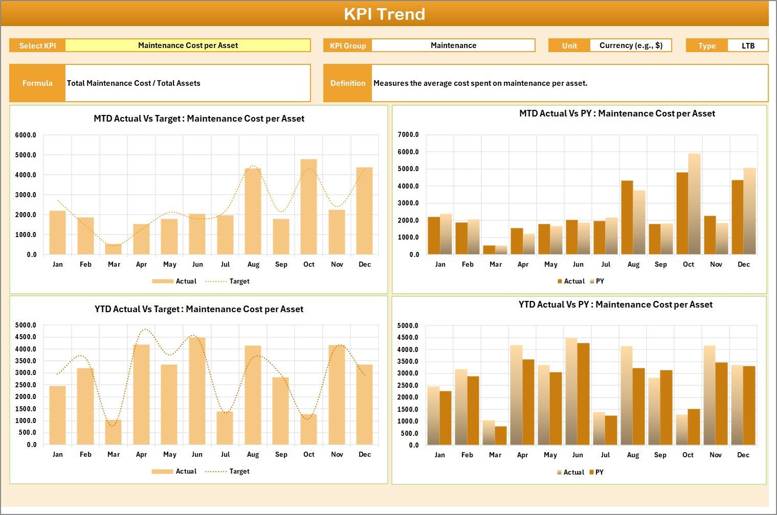 Analyze performance trends over months or years. Use dropdowns (cell C3) to select KPIs and explore MTD/YTD visuals against targets and previous years.