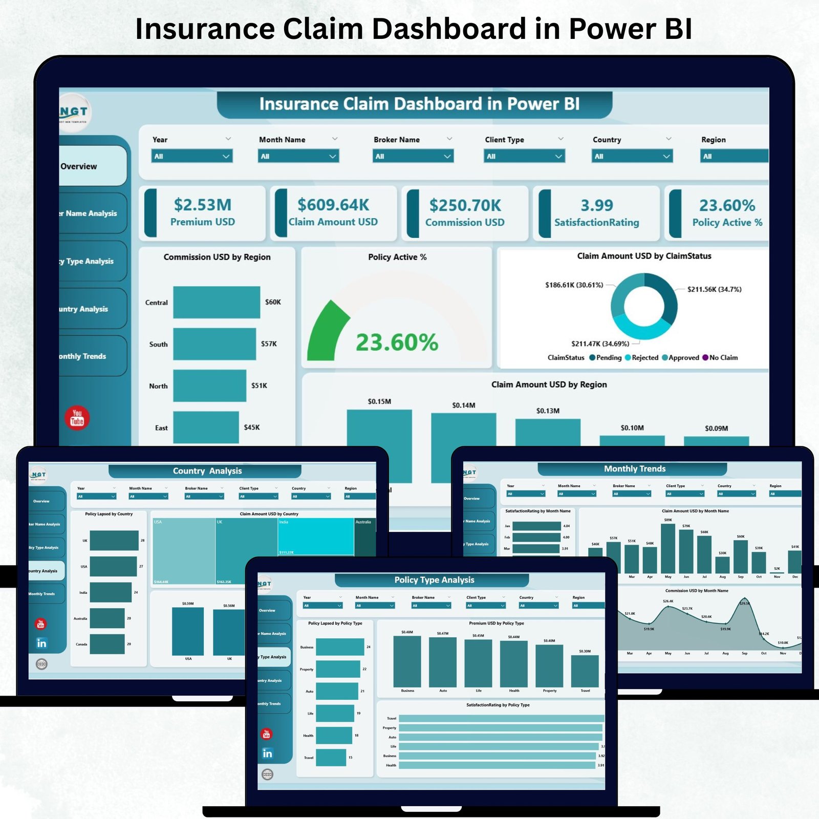The Insurance Claim Dashboard in Power BI gives a complete 360° view of all insurance claim activities. It brings together claim amounts, policy lapses, commissions, premiums, customer satisfaction ratings, regional behavior, and monthly patterns—all inside one professional dashboard. Whether you manage small claims or large international portfolios, this dashboard helps you stay in control at all times.