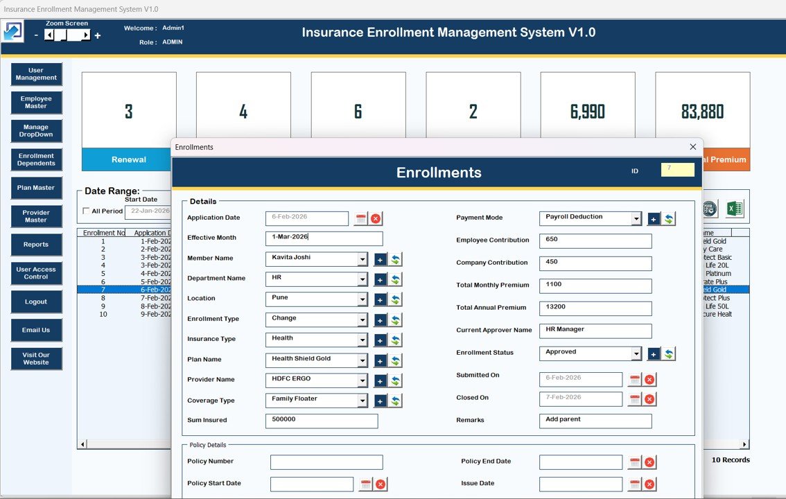 This ready-to-use system is developed using Microsoft Excel and VBA (Visual Basic for Applications) and provides a structured platform to manage insurance enrollments, employee data, insurance plans, providers, and reporting — all within one secure Excel environment.