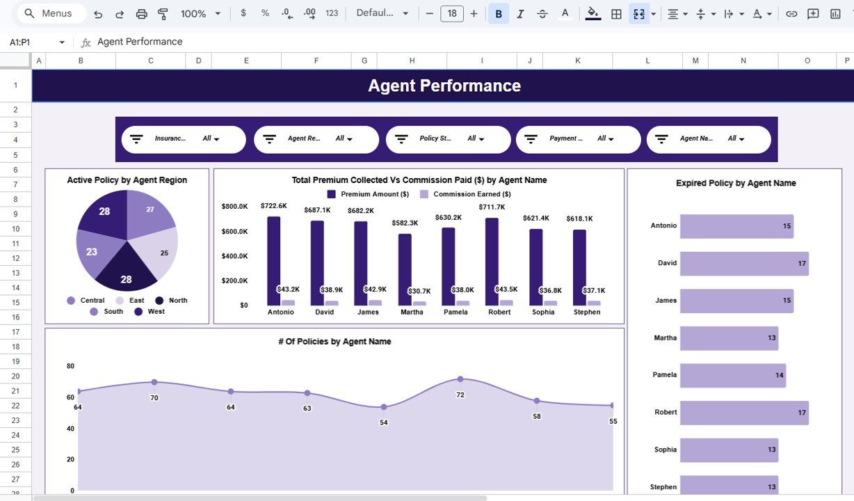 🔹 Agent Performance Tracking – Analyze premium collected, policies issued, and expired policies by agent name and region
