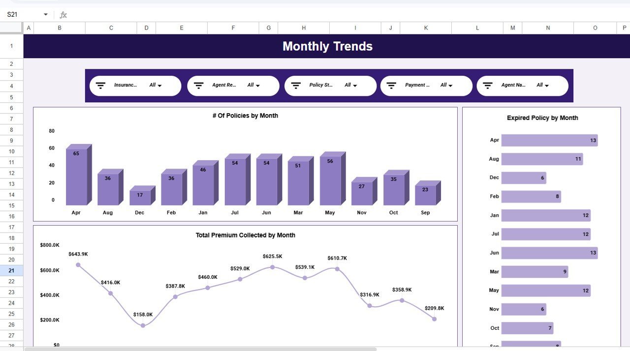 🔹 Monthly Trends View – Spot seasonal patterns in policy issuance, expirations, and premium collection