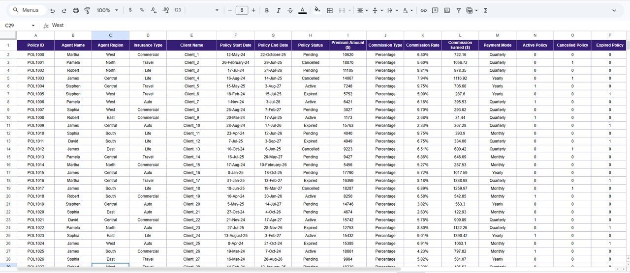 🔹 14+ Auto-Updating Charts – Visualize policy status, insurance types, commission breakdowns, agent regions, payment modes, and monthly trends
