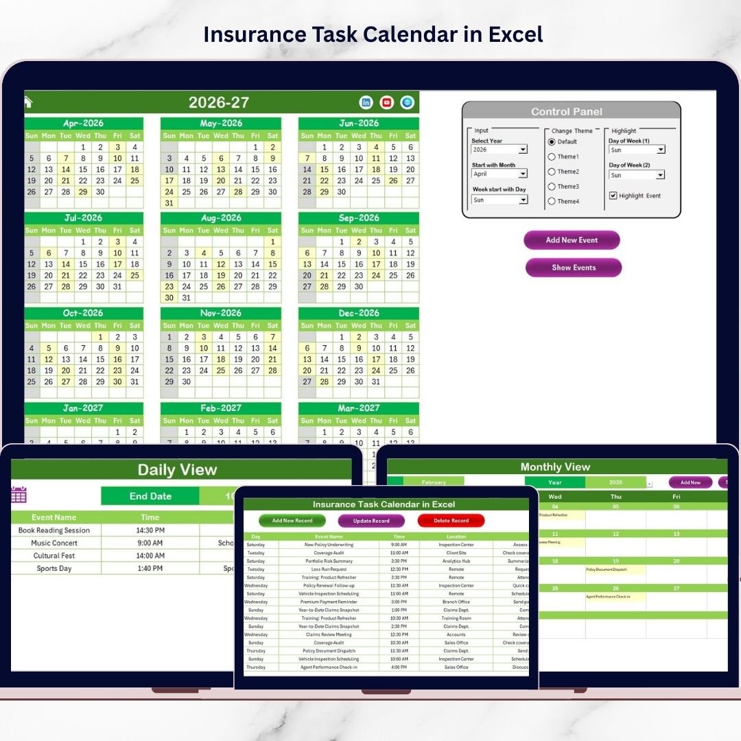 The Insurance Task Calendar in Excel is a ready-to-use, professional scheduling system built specifically for insurance teams who manage daily deadlines, policy renewals, claim follow-ups, audits, meetings, and internal reviews. Instead of juggling multiple tools, you can plan, track, and manage every insurance activity inside one structured Excel calendar.