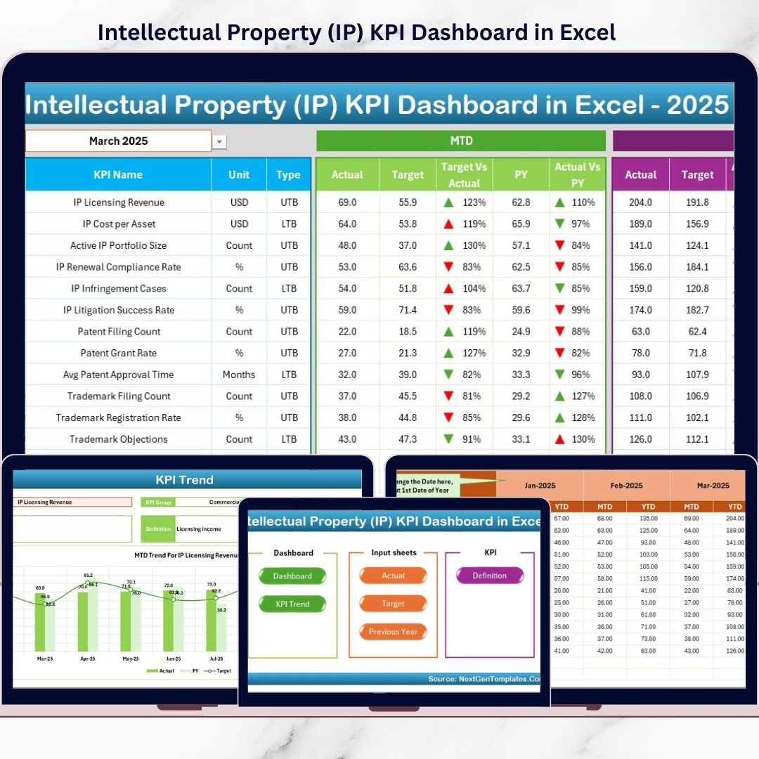 This ready-to-use Excel dashboard helps organizations monitor IP performance in a structured, visual, and measurable way. Instead of manually compiling reports, this dashboard provides MTD, YTD, Target vs Actual, and Previous Year comparisons—all in one professional Excel file.