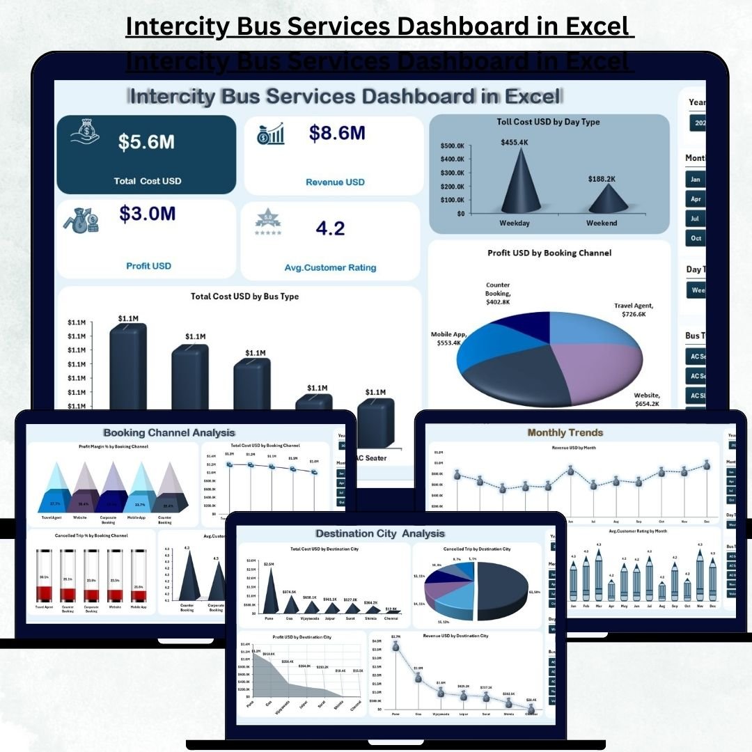 Intercity Bus Services Dashboard in Excel Running intercity bus services requires constant monitoring, accurate reporting, and real-time insights. Every day, transport companies manage hundreds of trips, multiple routes, fluctuating fuel costs, booking channels, cancellations, and thousands of passengers. Handling this manually becomes confusing, slow, and inefficient. Intercity Bus Services Dashboard in Excel Intercity Bus Services Dashboard in Excel That’s exactly why the Intercity Bus Services Dashboard in Excel is the perfect solution for transport companies of any size.