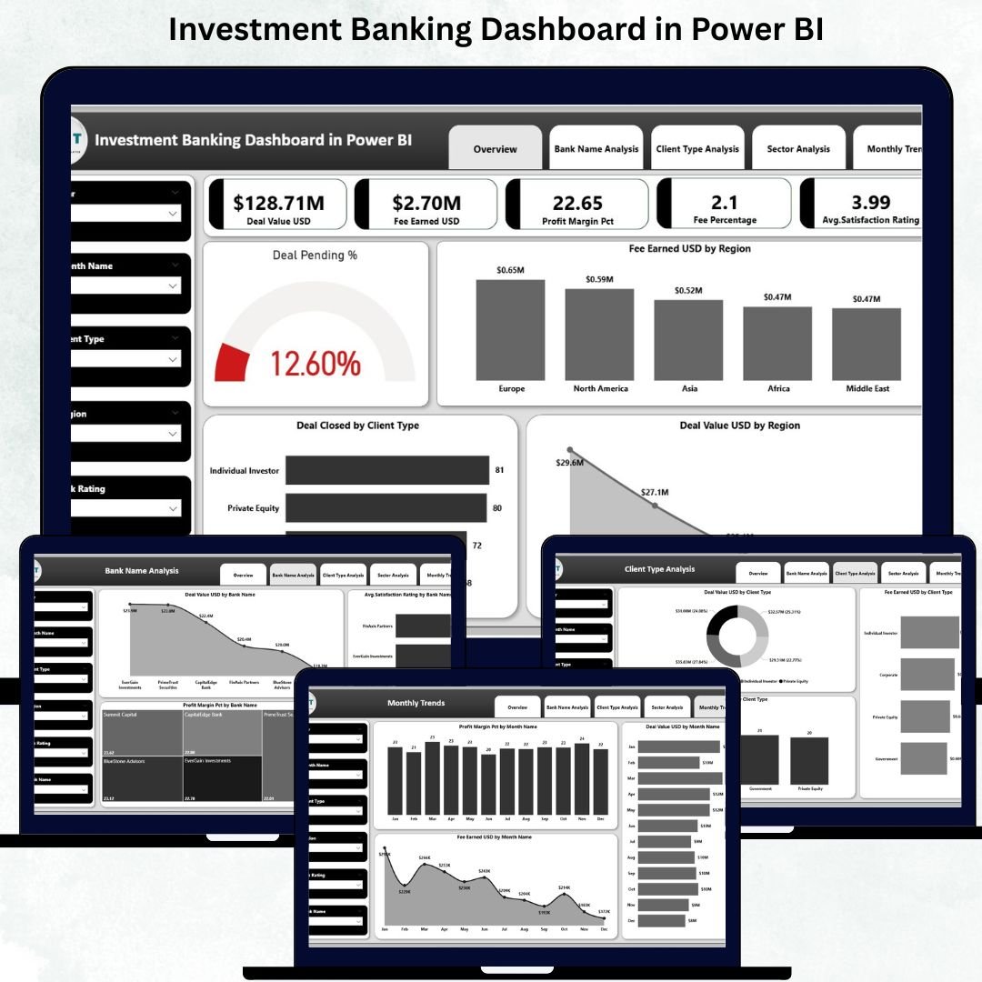 Investment Banking Dashboard in Power BI the Investment Banking Dashboard in Power BI solves all these challenges and transforms the way financial teams operate. Investment Banking Dashboard in Power BI With this dashboard, you get a clean, interactive, and visually rich reporting environment where you can track deal flow, analyze fee earned, compare banks, evaluate sectors, and monitor profit margins—all inside one modern, professionally designed Power BI report.