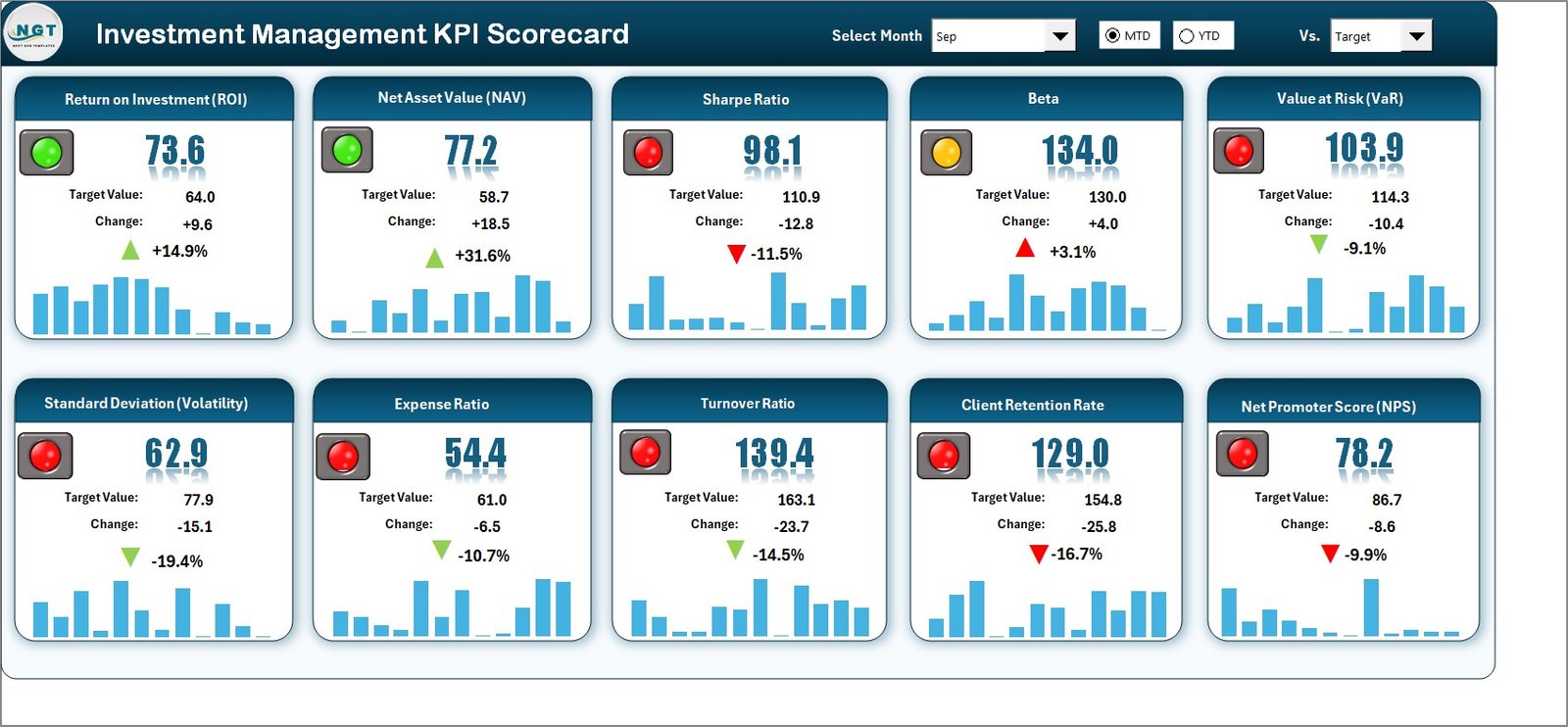 This Excel-based scorecard turns raw numbers into meaningful intelligence. Whether you’re measuring ROI, AUM growth, expense ratio, or client retention, it provides Month-to-Date (MTD) and Year-to-Date (YTD) comparisons that instantly reveal what’s working — and what needs attention.