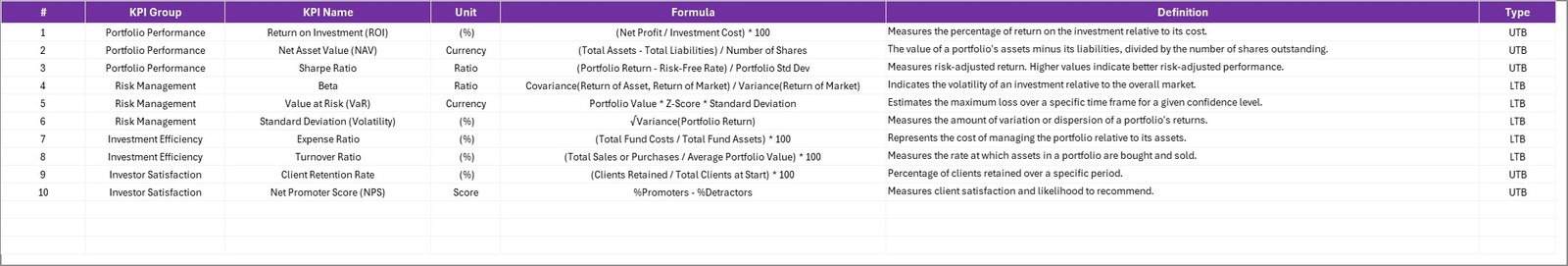 💰 Financial KPIs – Return on Investment (ROI), AUM Growth Rate, Portfolio Turnover, Expense Ratio, Alpha & Beta.