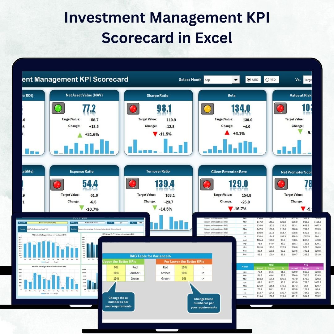 In the fast-paced financial world, smart investors rely on data 📊. To stay competitive, portfolio managers, mutual-fund analysts, and institutional-asset professionals must monitor performance precisely and act quickly on insights. The Investment Management KPI Scorecard in Excel is the perfect solution — a ready-to-use, interactive tool that tracks, visualizes, and compares your investment KPIs with absolute clarity.
