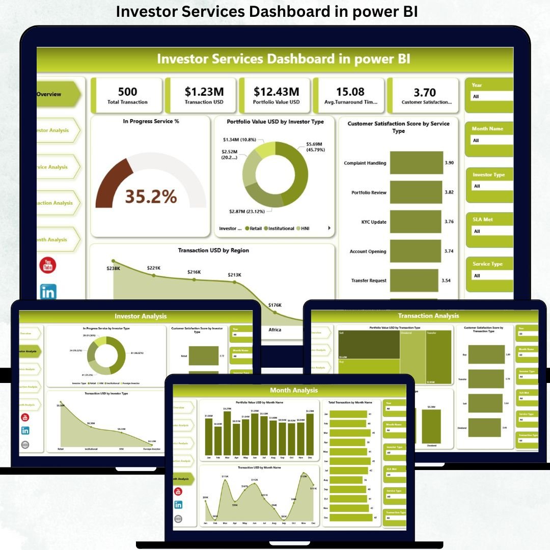 The Investor Services Dashboard in Power BI includes five structured analytical pages, each answering critical business questions.