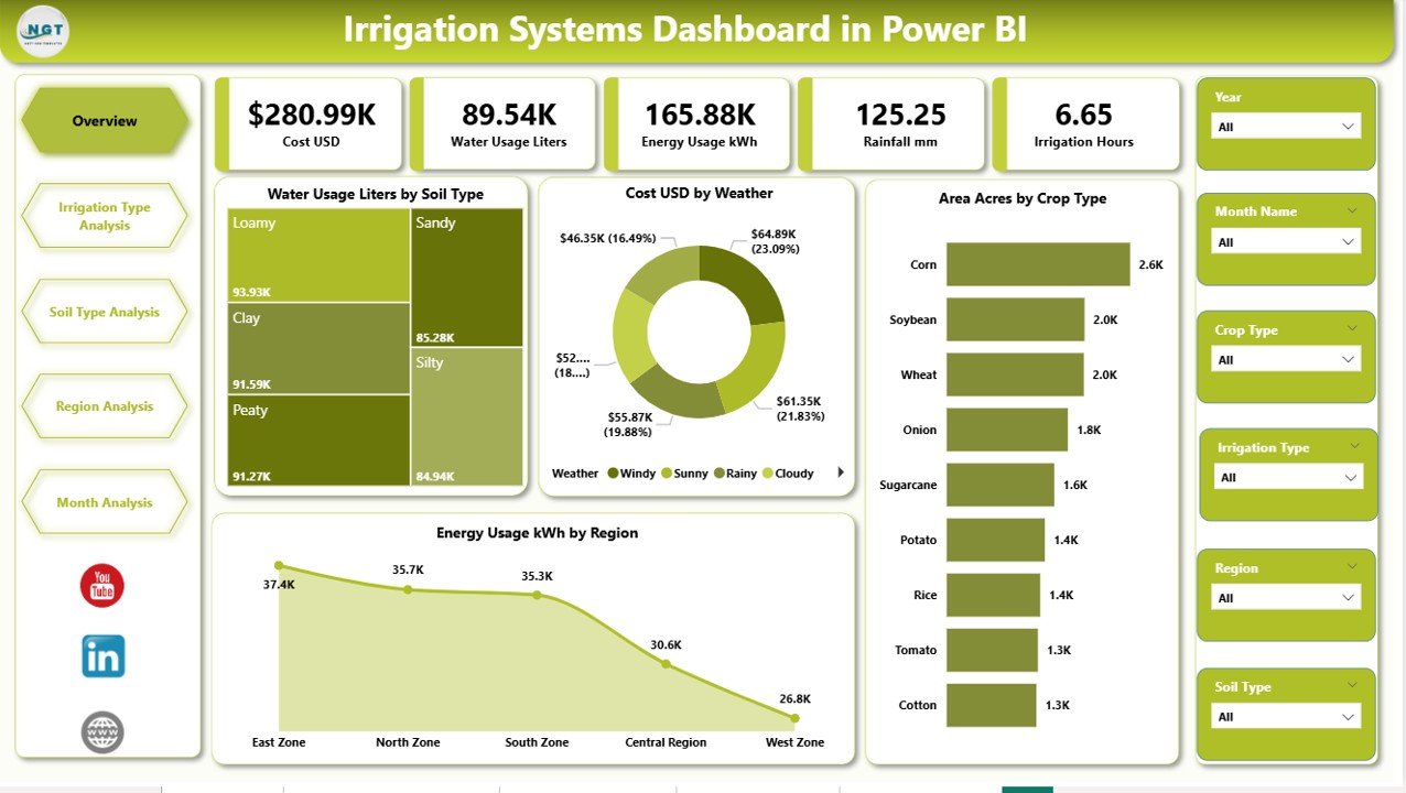 This professionally designed dashboard includes five powerful analytical pages, each focused on a critical irrigation question.