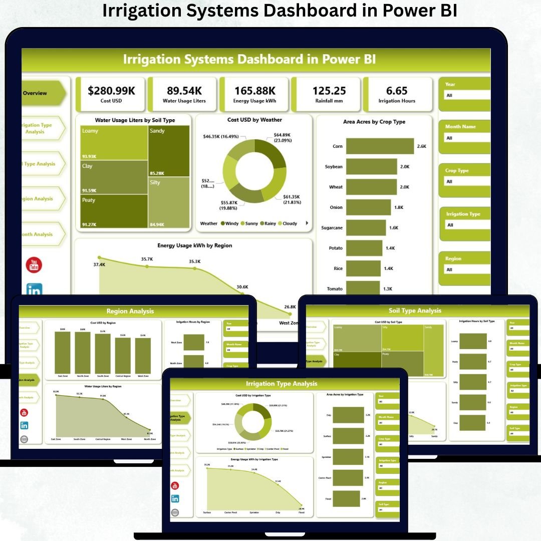 The Irrigation Systems Dashboard in Power BI is a ready-to-use, interactive analytics solution that converts complex irrigation data into clear KPIs, visual insights, and actionable trends. Built on Power BI, this dashboard allows users to monitor water usage, irrigation cost, energy consumption, soil efficiency, and crop coverage in real time. Instead of spending hours analyzing raw data, users can instantly identify inefficiencies, reduce waste, and optimize irrigation strategies.