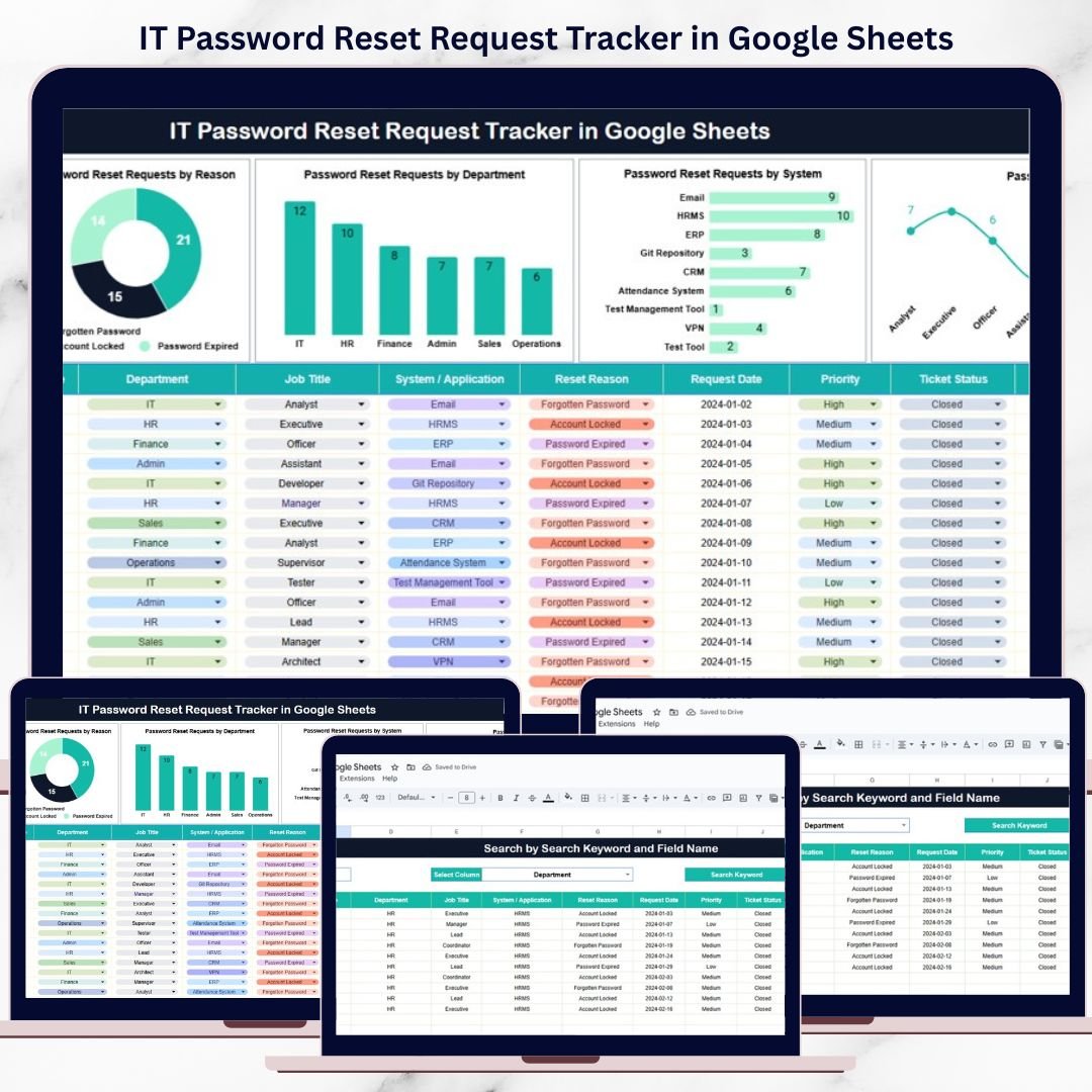 This ready-to-use tracker provides a centralized and structured way to log, monitor, and analyze all password reset requests in one place. Instead of reacting to scattered messages, IT teams gain complete visibility into request status, reasons, departments, systems, and job roles. With built-in charts and a smart search feature, the tracker transforms routine password resets into measurable, manageable IT operations—all inside Google Sheets.