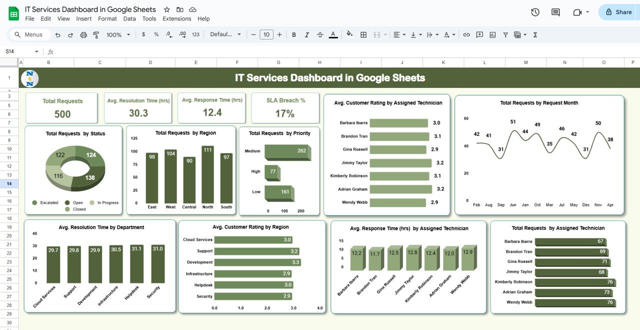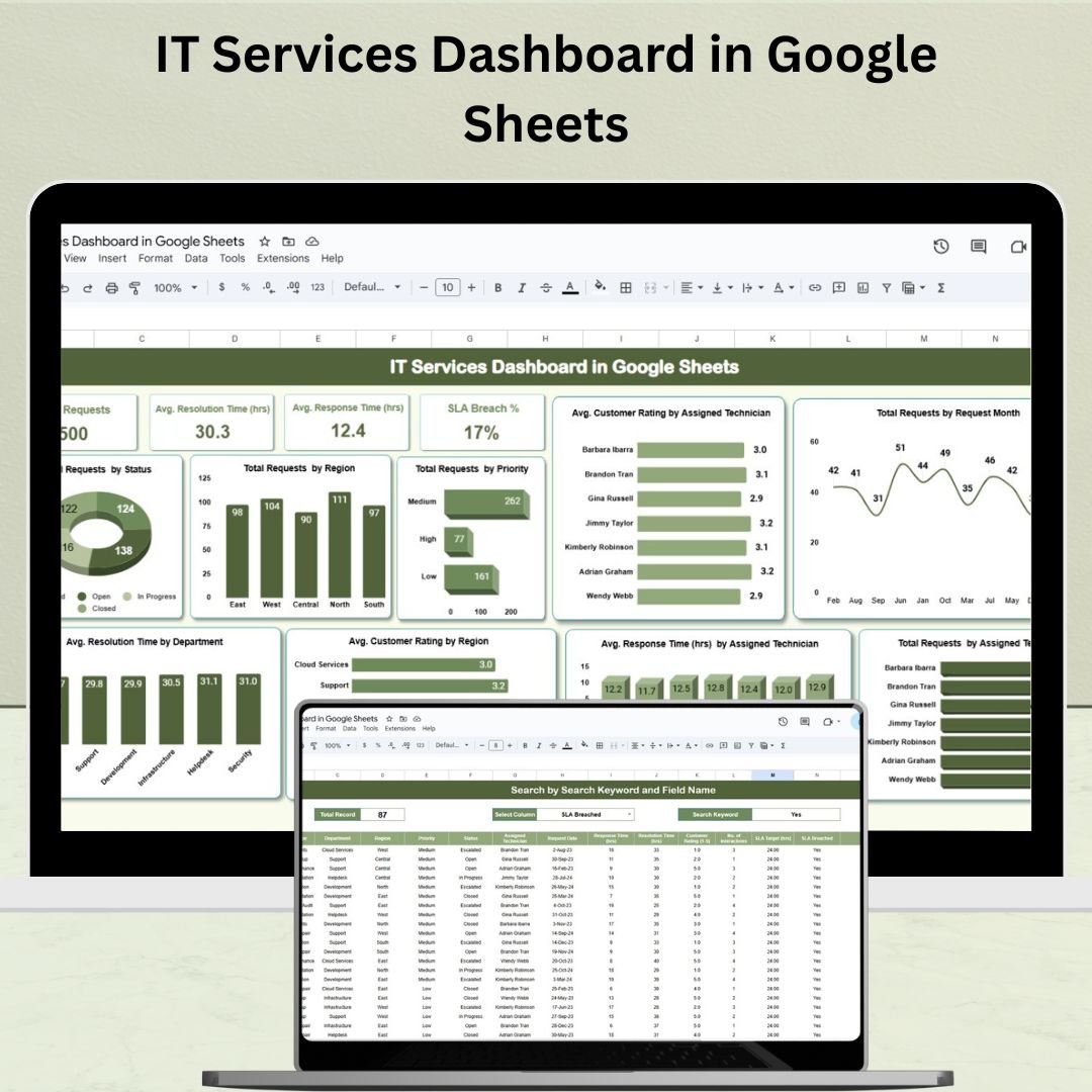 📊 Transform your IT service management with this powerful, ready-to-use Google Sheets Dashboard—track requests, SLAs, technician performance, and more in real time!IT Services Dashboard in Google Sheets