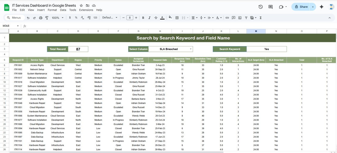 Enter Data: Log service requests into the Data Sheet. Include request details, SLAs, and technician info.