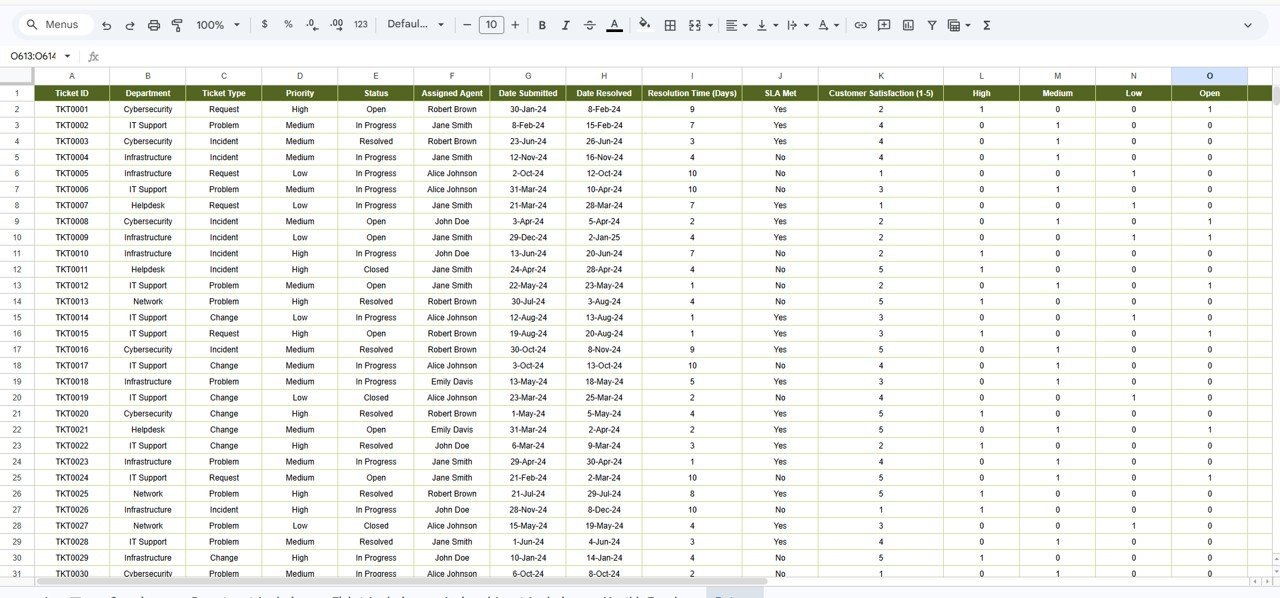 Monthly Trends📋 Data Sheet Tab — The structured data input sheet containing all ticket records. Replace the sample data with your own IT ticket records in the same column format and all dashboard pages update automatically.