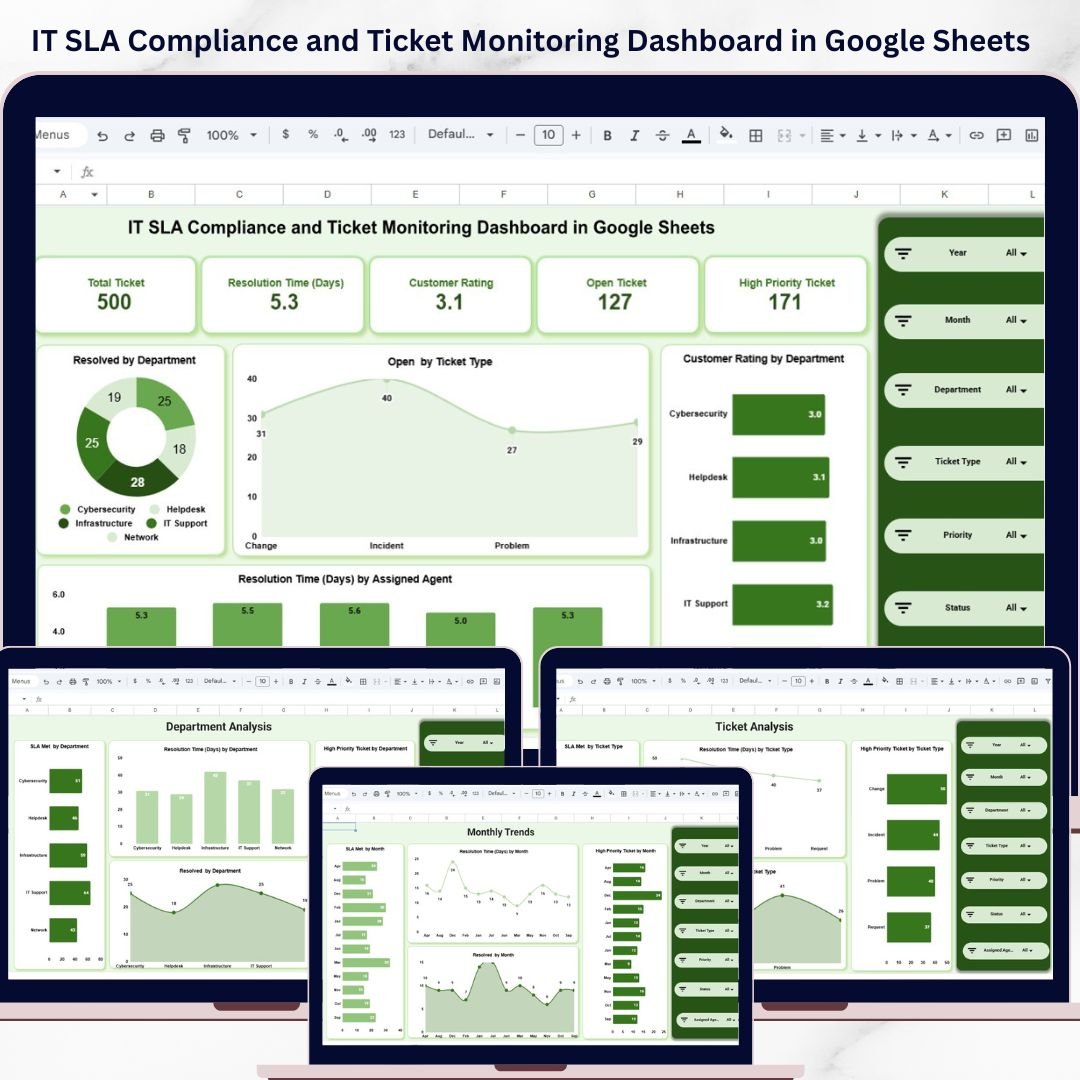 IT SLA Compliance and Ticket Monitoring Dashboard in Google Sheets is a powerful, ready-to-use analytics template built for IT service managers, help desk supervisors, IT operations leads, and managed service providers who need to track SLA compliance rates, monitor ticket volumes, analyze resolution times, and evaluate agent performance from a single collaborative Google Sheets dashboard. This template includes 5 interactive dashboard pages and a structured Data Sheet — giving you complete visibility into your IT ticketing operations and SLA performance at a glance.