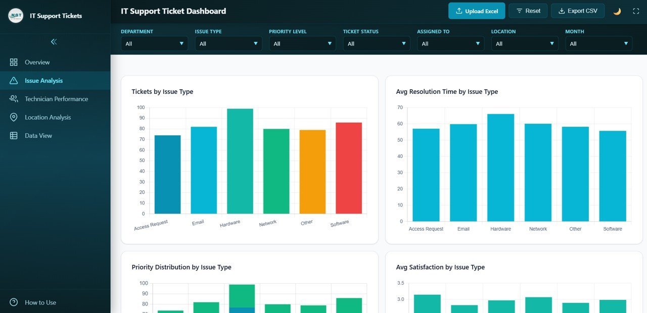This dashboard can track any type of IT support issue including hardware failures, software bugs, network problems, access requests, password resets, system outages, and more. The Issue Analysis page provides detailed breakdowns by issue category.