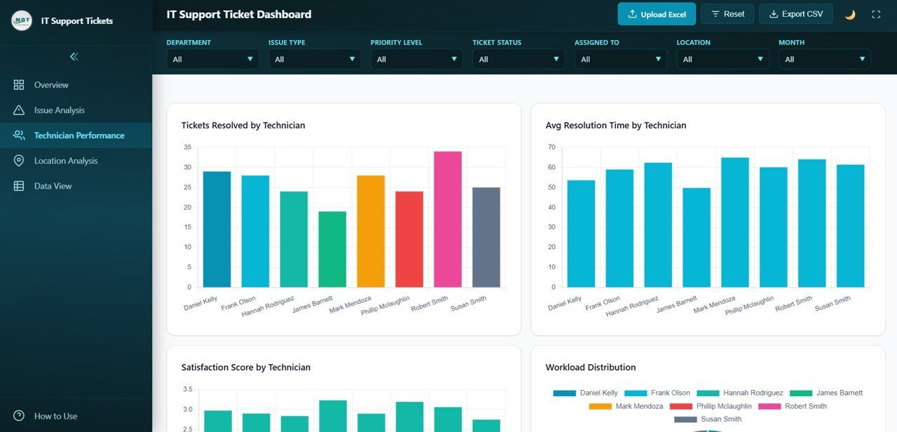 Issue Analysis🔹 Technician Performance Page – Evaluate your IT team with Tickets Resolved by Technician, Avg Resolution Time by Technician, Satisfaction Score by Technician, and Workload Distribution charts for performance reviews and resource planning.