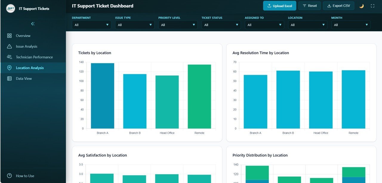 Technician Performance🔹 Location Analysis Page – Compare IT support metrics across sites with Tickets by Location, Avg Resolution Time by Location, Avg Satisfaction by Location, and Priority Distribution by Location.